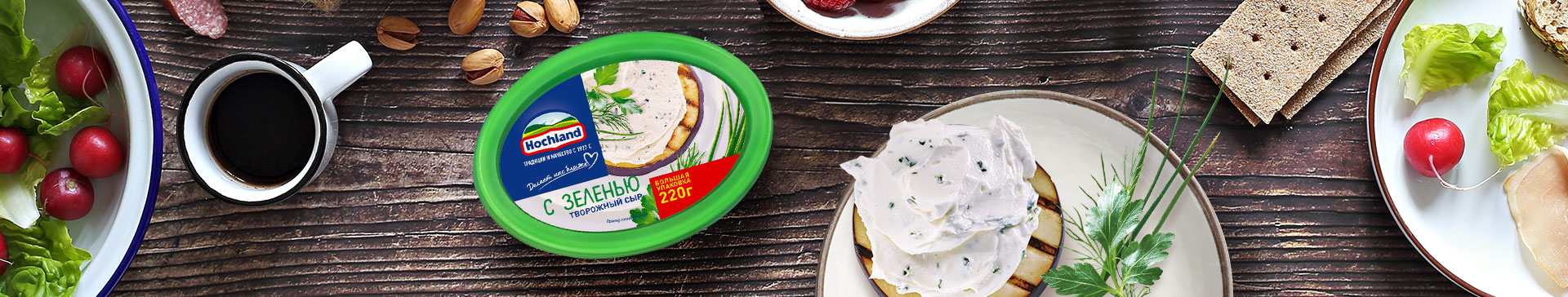 Творожный сыр Hochland с зеленью – идеальное нежное сочетание сливочного вкуса со свежестью душистой зелени. Сделан из творога, приготовленного из натуральных сливок и молока. Сыр обладает приятной консистенцией и легко намазывается на хлеб, горячие тосты и хрустящие крекеры. Он идеален для дополнения как классических бутербродов, так и более интересных блюд - блинчиков, равиоли, творожно-сырной лепешки.