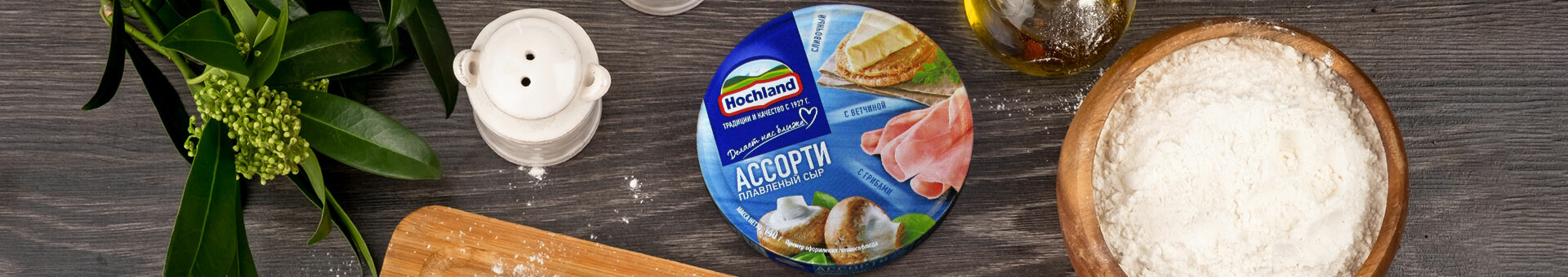 Плавленый сыр Hochland Ассорти «Синее» в кругах обладает большим разнообразием вкусов.
