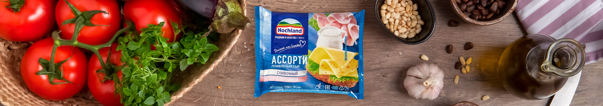 Ломтики Hochland Ассорти созданы специально для тех, кому сложно выбрать между любимыми вкусами. Ведь ломтики Ассорти сочетают в себе одновременно 2 вкуса: нежный сливочный сыр и сыр с кусочками настоящей ветчины. Так легко разнообразить свой бутерброд с ломтиками Hochland Ассорти!