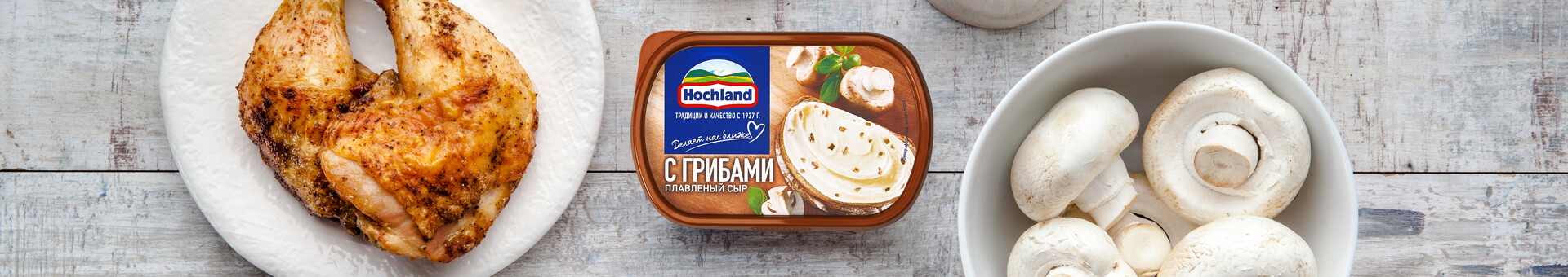 В плавленом сыре Hochland с грибами не просто много, а очень много аппетитных кусочков настоящих шампиньонов. Он изготавливается из полутвердых сыров, обладает нежным сливочным вкусом, легким грибным ароматом и однородной кремовой консистенцией. Плавленый сыр Hochland хорошо намазывается на хлеб, он идеально подходит как для приготовления бутербродов на завтрак и сэндвичей в дорогу, так и для сытных рулетов и канапе, сырных соусов, супов и горячих блюд.