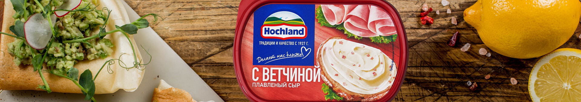 В плавленом сыре Hochland с ветчиной не просто много, а очень много кусочков настоящей ветчины. Высококачественная натуральная ветчина измельчается на кусочки прямо перед добавлением в плавленый сыр. Побалуйте себя ярким насыщенным вкусом любимого плавленого сыра Хохланд с ветчиной!