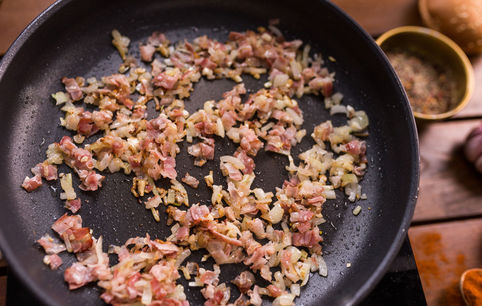 Обжариваем половинки булочек на сухой сковороде с одной стороны. Обжариваем измельченные лук, чеснок и бекон до хрустящей корочки.