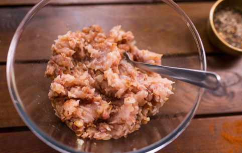 Смешиваем фарш с солью, перцем, паприкой и луковой смесью.