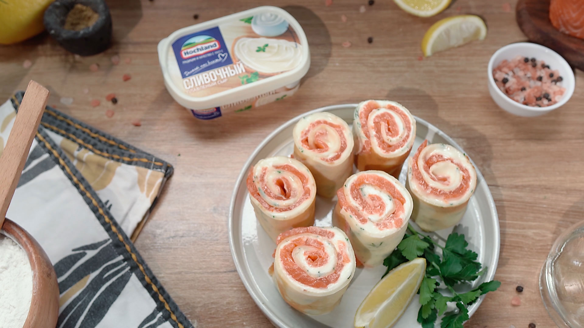 - Готовый блин смазываем плавленным сыром, сверху выкладываем тонко нарезанное филе лосося, сворачиваем в рулет.
