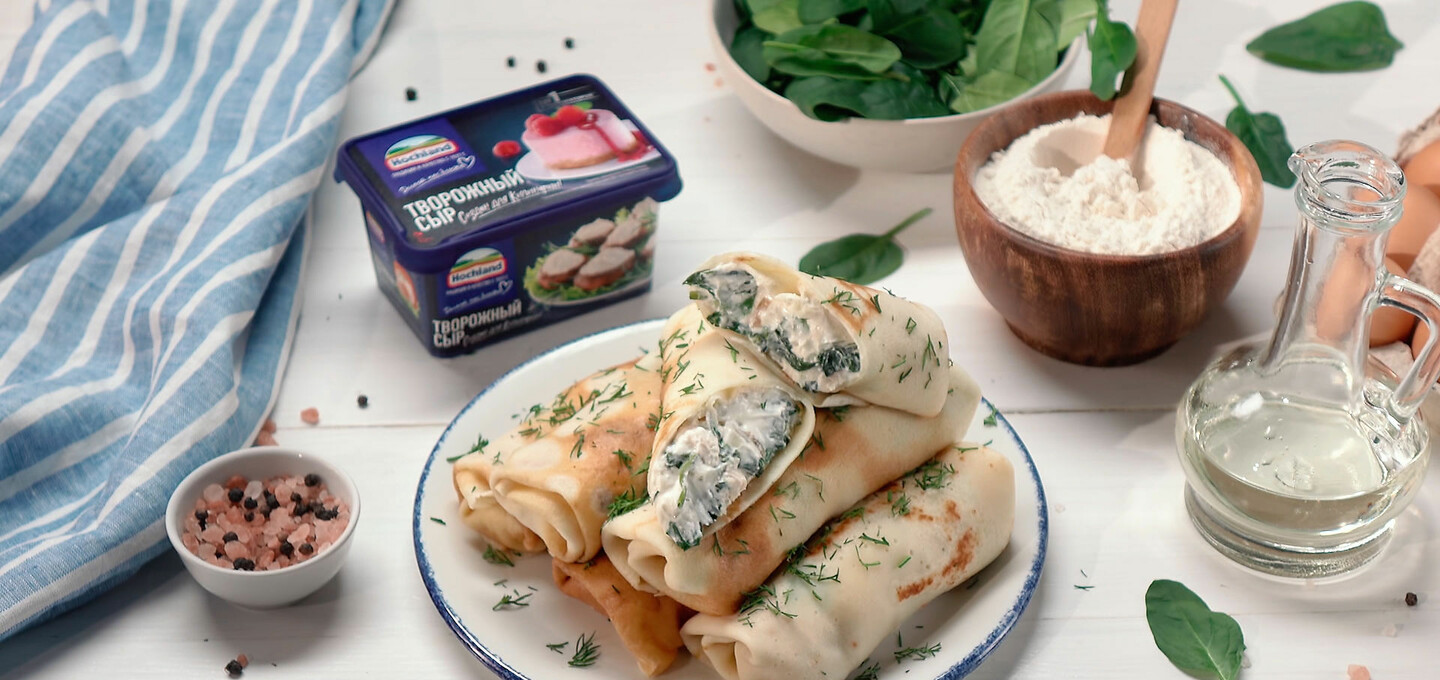 - В центр готового блинчика выкладываем начинку и сворачиваем в рулет.