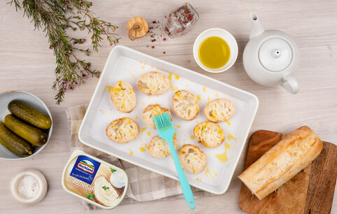 Разогрейте духовку до 200 °С. Нарежьте багет кусочками толщиной 1 см. Смажьте хлеб оливковым маслом и запеките в духовке до золотистого цвета, 10 мин.