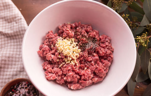 Смешиваем фарш с солью, перцем, тмином и измельченным чесноком.