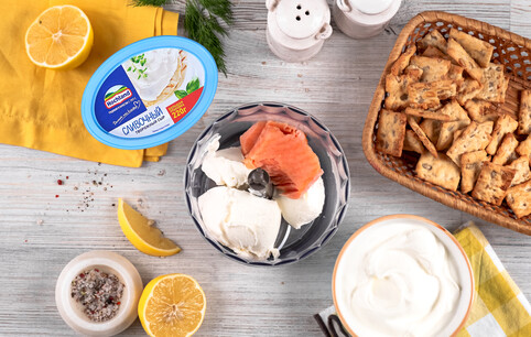 Лосось горячего копчения разберите на кусочки. Положите в чашу блендера и измельчите. Добавьте творожный сыр, сметану и лимонный сок, взбейте до однородности.