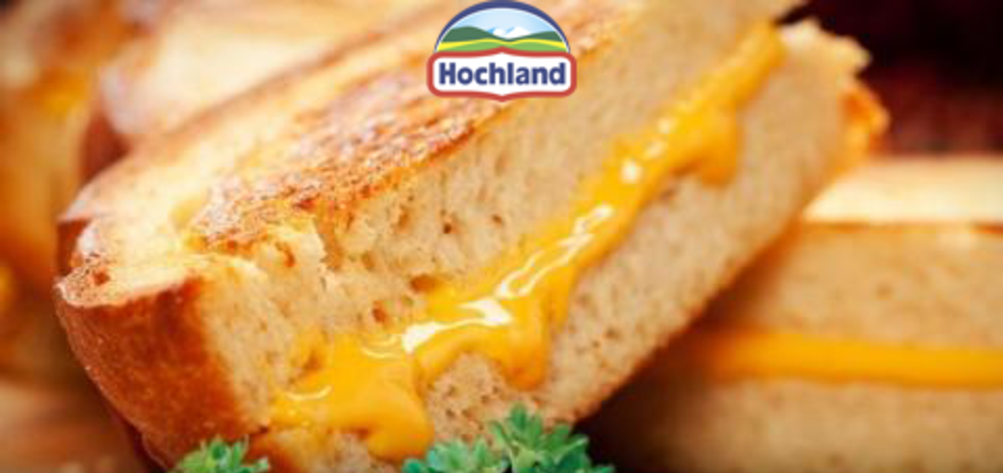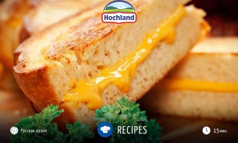 - На горячий хлеб выложите по ломтику плавленого сыра Hochland Чизбургер.