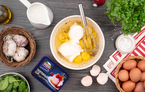 Взбейте яйца до однородности с солью и перцем. Добавьте молоко и творожный сыр, хорошо перемешайте.