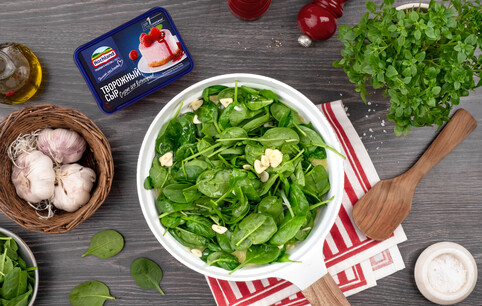 В сковороде разогрейте смесь оливкового и сливочного масел и обжарьте лук, 4–5 мин. Добавьте чеснок и шпинат, перемешивайте, пока листья не станут мягкими. Немного посолите и поперчите.
