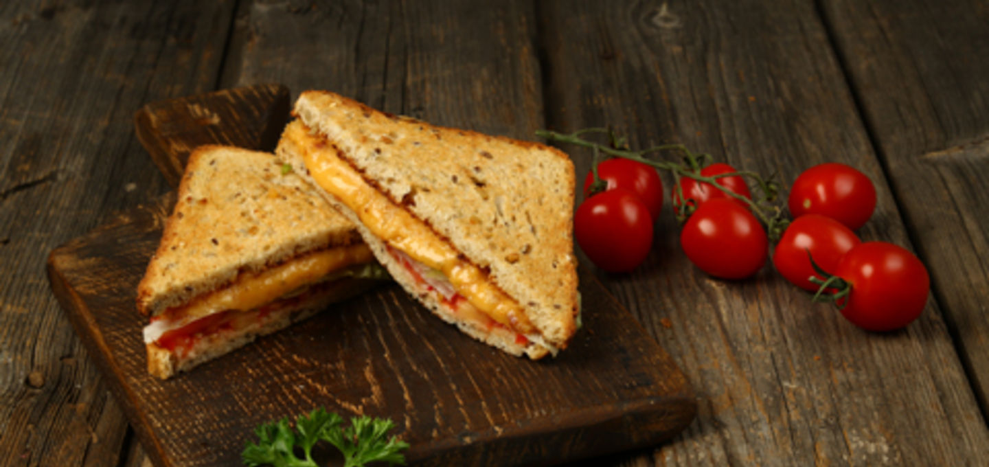 - На нежный горячий сырный сэндвич положить лист молодого свежего салата, кружки спелого томата и половинки перепелиного яйца, закрыть второй частью сэндвича и разрезать острым ножом.