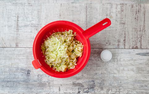 Натрите кабачки на крупной терке, немного посолите и выложите в дуршлаг. Оставьте на 20 мин. – пусть стечет лишняя жидкость.