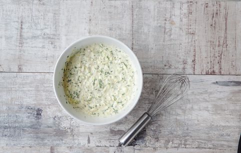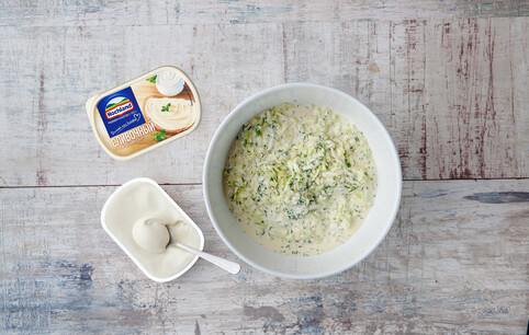 Мелко нарежьте зелень. Взбейте яйцо, смешайте со сливочным сыром. Соедините сырную массу с кабачками и зеленью.