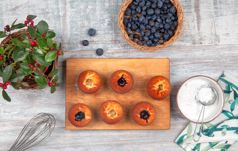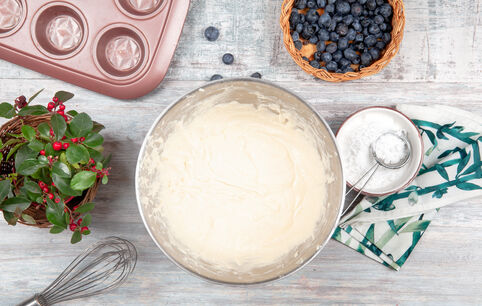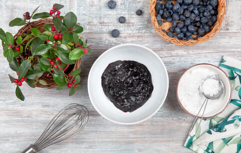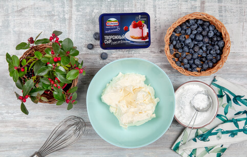 Для начинки положите чернику с сахаром в сотейник, влейте 2 ст. л. воды и лимонный сок и доведите до кипения. Смешайте крахмал со 100 мл холодной воды и влейте в сотейник с черникой, размешайте и проварите 3 мин., до загустения. Остудите.