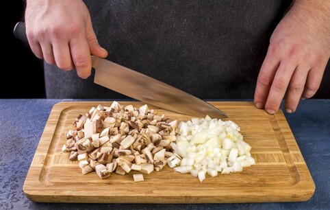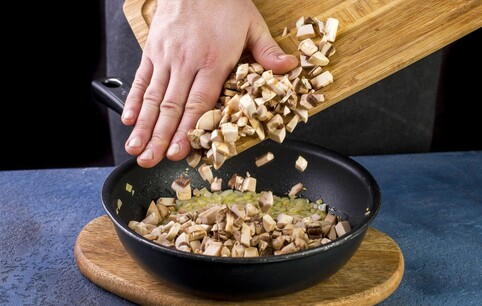 На сковороде в сливочном масле обжарьте лук до золотистого цвета. Добавьте грибы. Посолите и поперчите. Тушите под крышкой до готовности (около 15 минут).