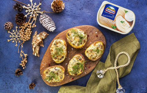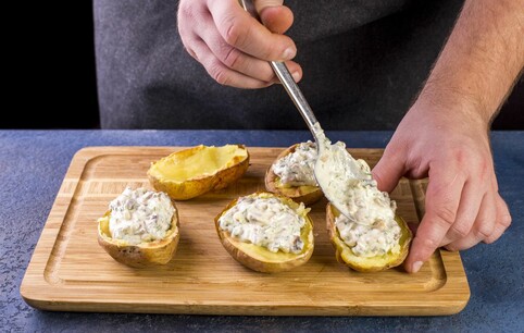 Получившейся смесью наполните половинки картофеля и выложите на противень, застеленный пергаментной бумагой.