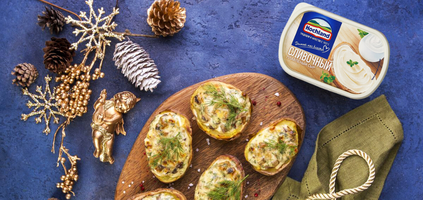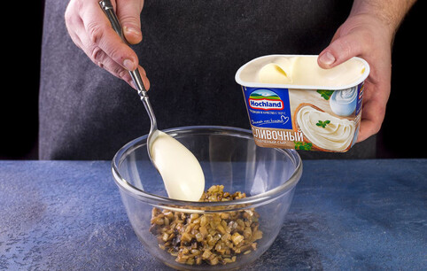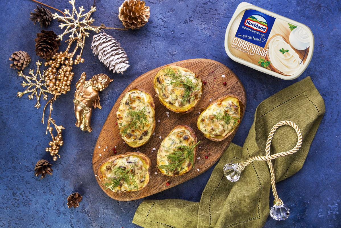 В готовые грибы добавьте картофельную мякоть, сметану, мелко нарезанный укроп, плавленый сыр Hochland «Сливочный» и перемешайте.