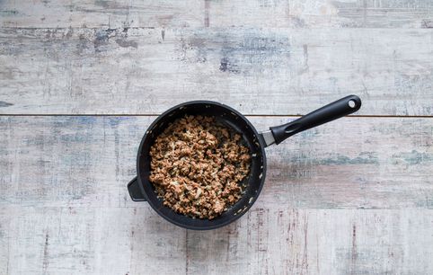 Мелко нарежьте очищенный лук, обжарьте в сливочном масле до золотистого цвета. Положите фарш, увеличьте огонь до максимума и готовьте, все время помешивая и разбивая комки, пока фарш не изменит цвет.