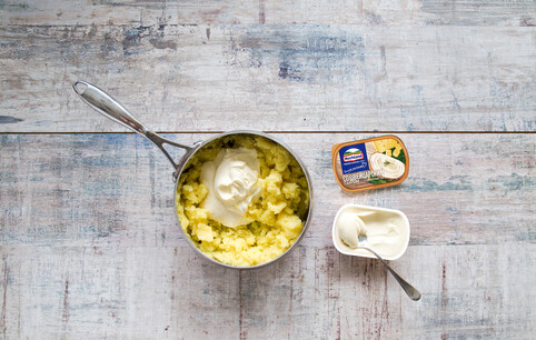 Разогрейте духовку до 180 °С. Картофель очистите и сварите в подсоленном кипятке до мягкости. Слейте почти всю воду, растолките картофель в пюре, добавьте плавленый сыр, перемешайте. Добавьте взбитые яйца, перемешайте до однородности, посолите.