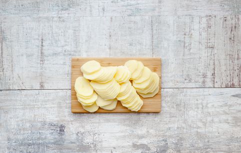 Очистите картофель и нарежьте при помощи терки-мандолины или ножом очень тонкими (2–3 мм) кружками.