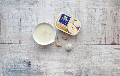 Смешайте подогретое молоко и плавленый сыр, поперчите. Добавьте пропущенный через пресс чеснок.