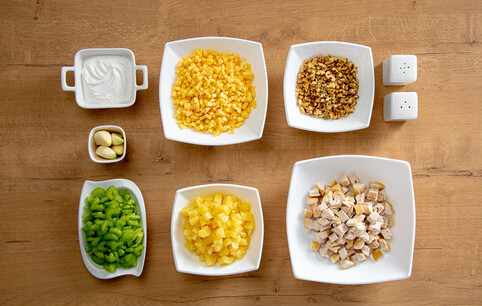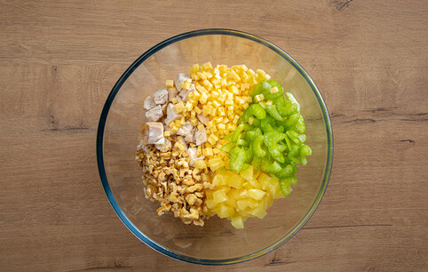 Запеченное куриное филе нарежьте небольшими кусочками (кубиками или ломтиками толщиной 1.5 см) и сложите в глубокую миску. С ананасов слейте жидкость и добавьте к курице.