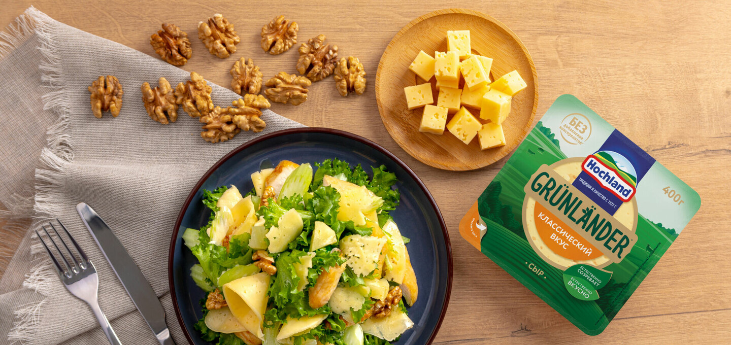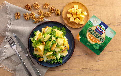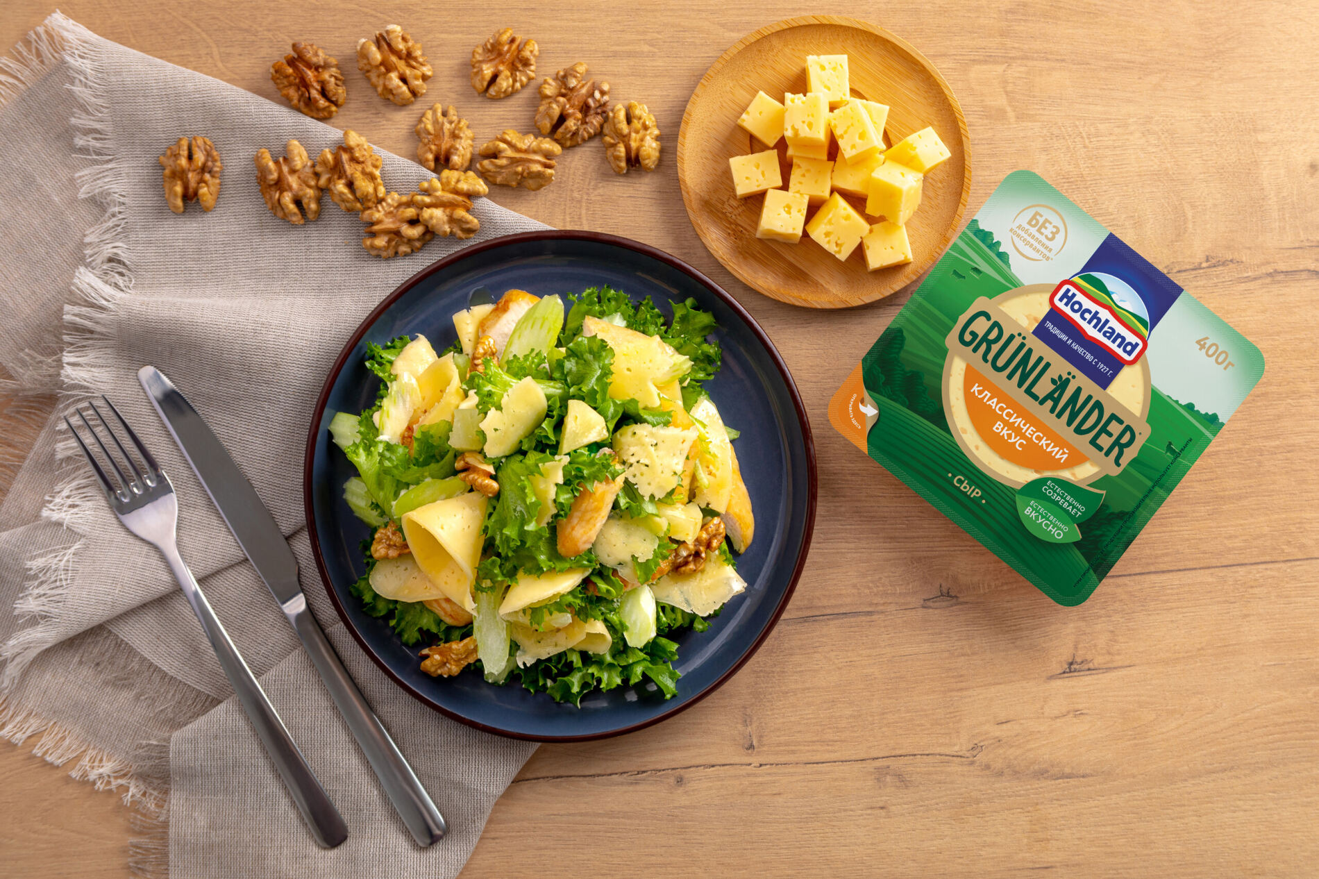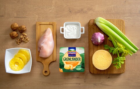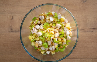 Стебли сельдерея нарежьте толщиной 0.2 см, а грецкие орехи поломайте кусочками. Добавьте к курице с ананасами. Нарежьте сыр мелким кубиком или натрите на крупной терке. Можно оставить несколько кусков для украшения салата.