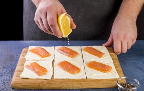 На квадратики выложите ломтики рыбы, сбрызните лимонным соком и поперчите.