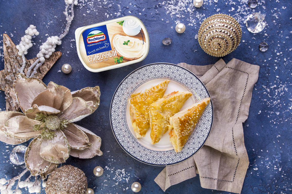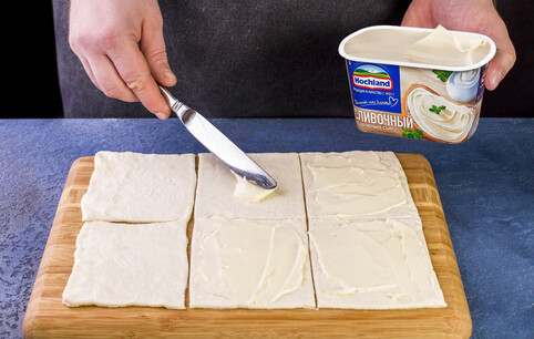Каждый квадрат смажьте плавленым сыром Hochland «Сливочный».