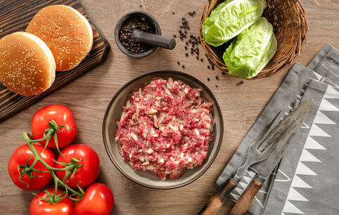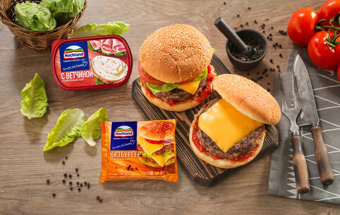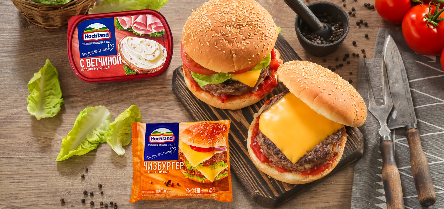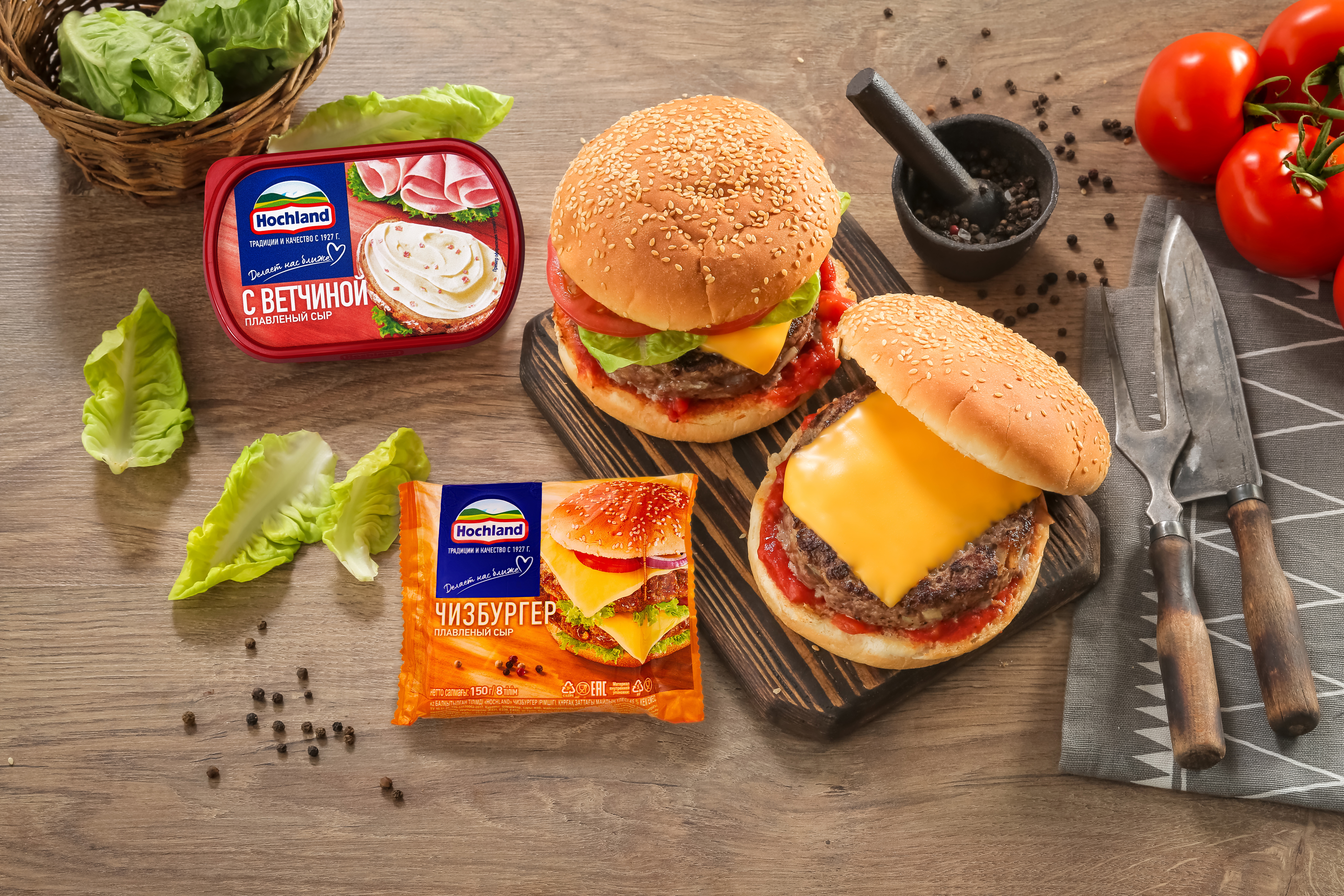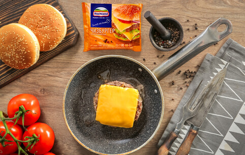 Сформируйте из фарша котлеты, в центр каждой положите плавленый сыр Hochland «С ветчиной». Разогрейте сковороду-гриль, немного смажьте маслом. Положите котлеты на сковороду и обжарьте с двух сторон до готовности. Положите на котлеты по ломтику сыра и готовьте 1–2 мин., чтобы сыр начал плавиться.