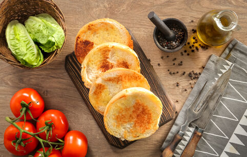 Разрежьте булочки пополам и положите срезом вниз на сковороду, жарьте 2–3 мин.