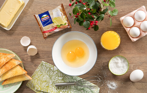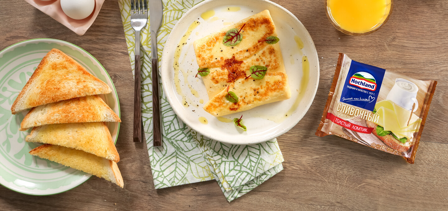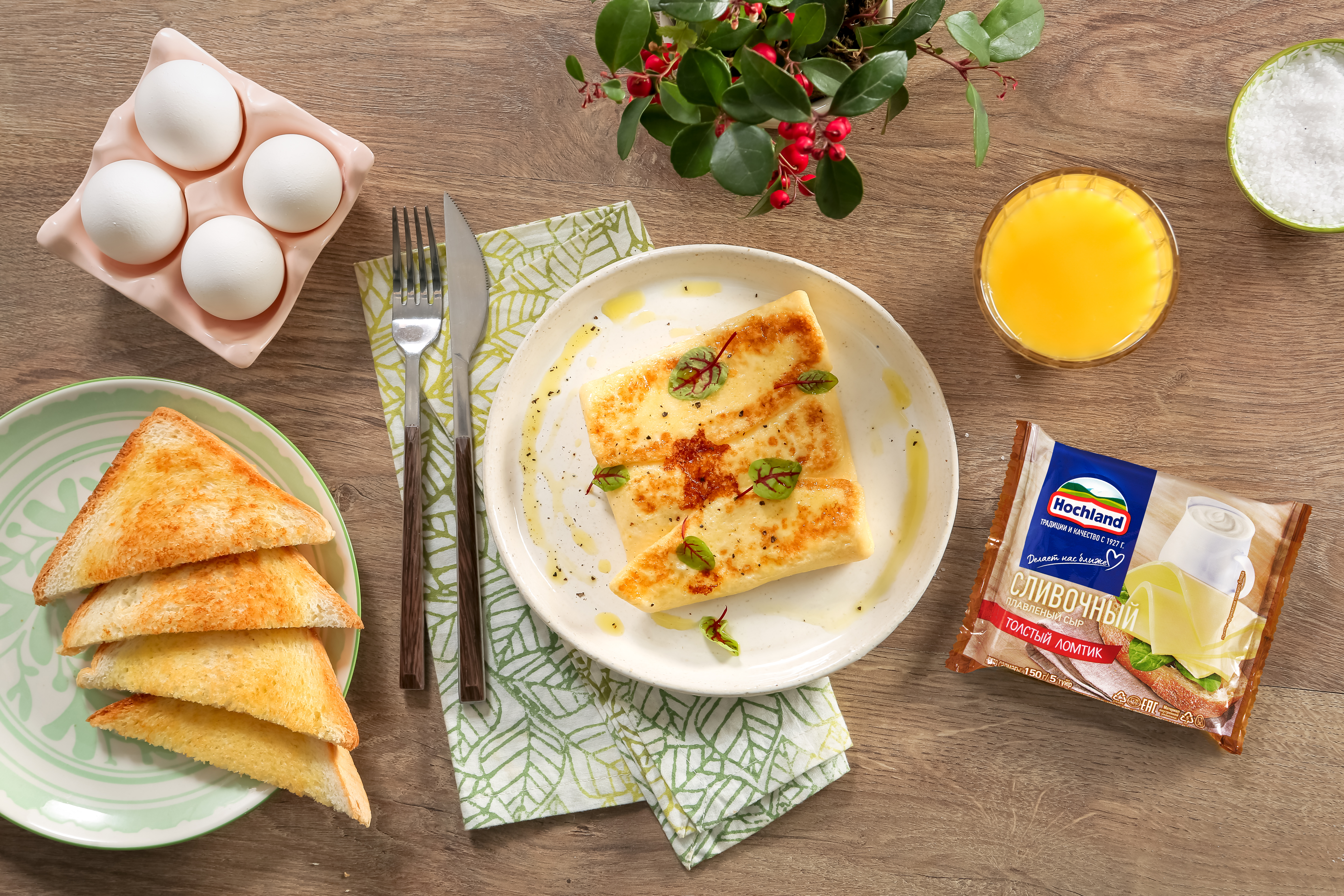 - 1 ломтик плавленого сыра Hochland «Сливочный» в ломтиках