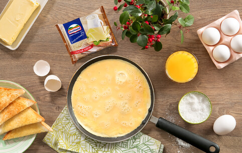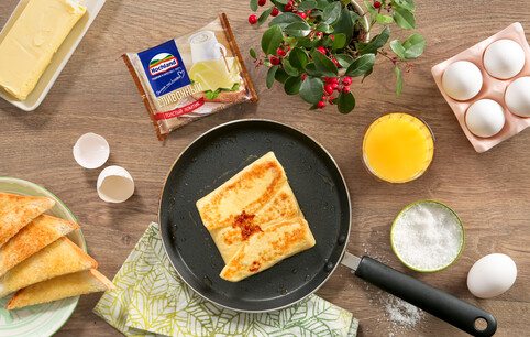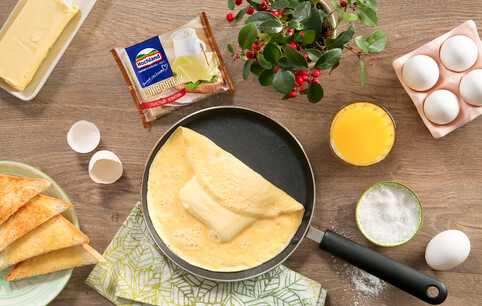 Положите ломтик сыра в центр и загните на него края омлета с четырех сторон, чтобы получился конверт. Аккуратно переложите омлет на тарелку и сразу же подавайте.