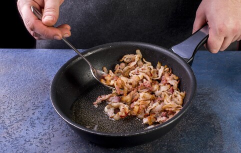 В отдельной сковороде обжарьте мелко нарезанный бекон.
