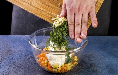 В масле, оставшемся после бекона, обжарьте морковь, натертую на крупной терке и нарезанный сельдерей. В миске смешайте обжаренный бекон, творожный сыр Hochland «Для кулинарии». Выдавите чеснок через пресс, добавьте мелко нарезанный укроп. Перемешайте.