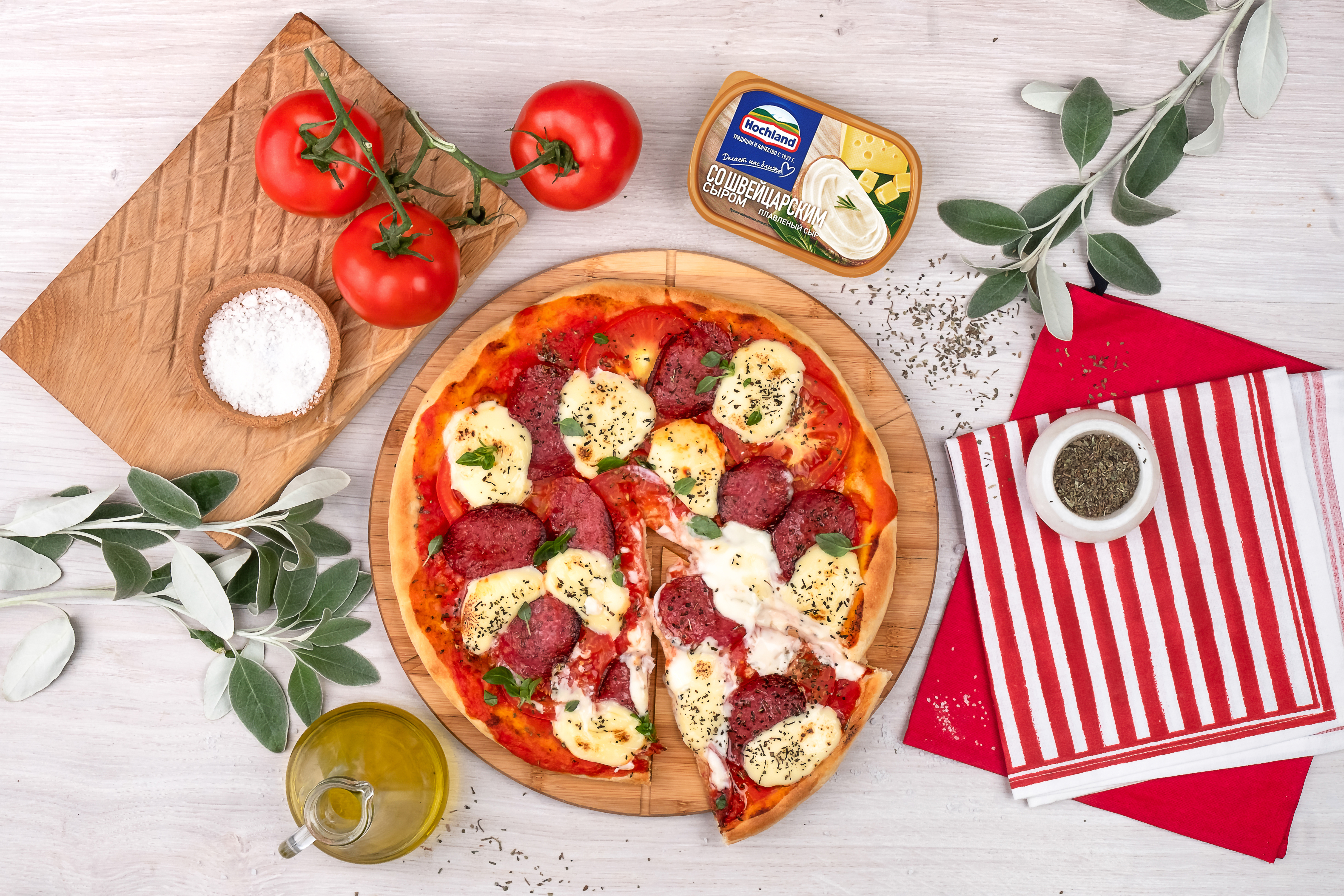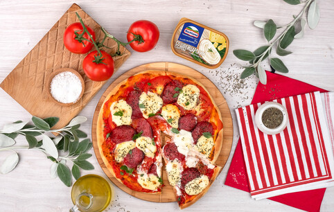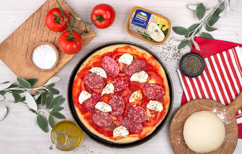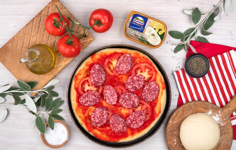 Пицца с плавленым сыром, помидорами и салями