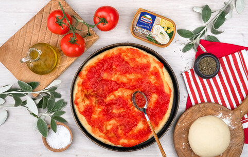 Положите тесто для пиццы на противень и смажьте томатным соусом.