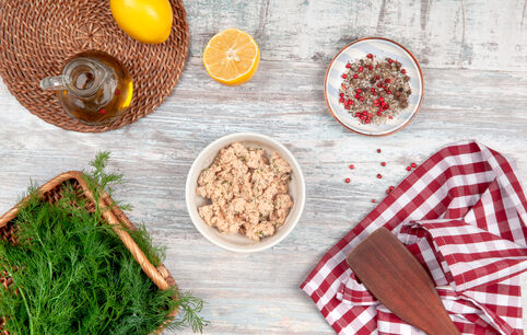 Для мусса разберите рыбу на небольшие кусочки. Положите в блендер и измельчите, смешайте с лимонным соком и мелко нарезанным укропом.