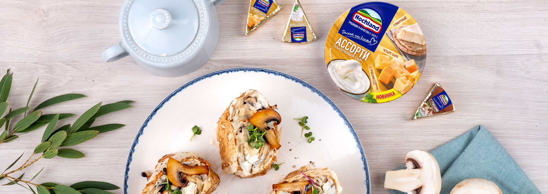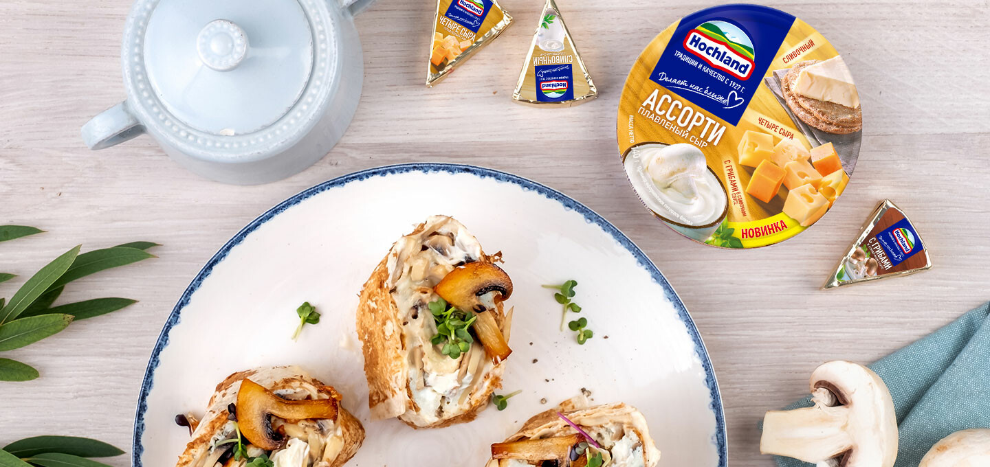 - 140 г плавленого сыра «Ассорти грибная корзина» Hochland в треугольниках