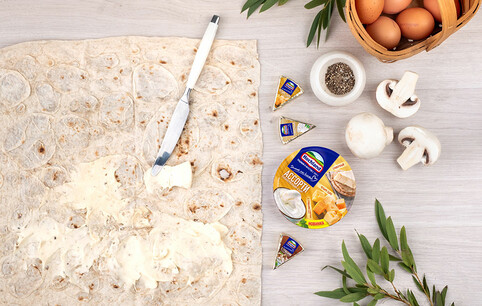 Лаваш смажьте плавленым сыром. Выложите на лаваш омлет и сверните плотным рулетом. Разрежьте ролл на порции и подавайте.