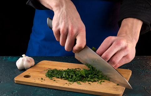 Мелко порубите чеснок и зелень.