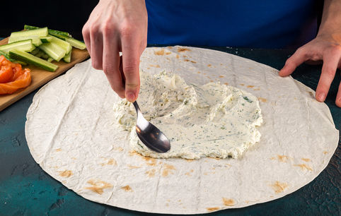 Смажьте лаваш сырной смесью и посыпьте перцем.