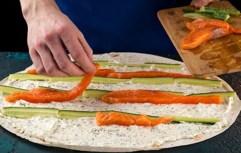 Выложите кусочки нарезанной семги и тонкие кружочки огурца.