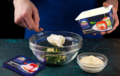 Смешайте зелень с творожным сыром и майонезом.