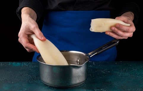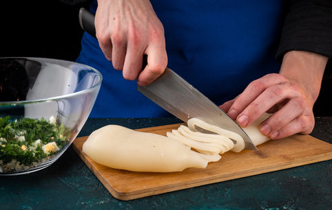 Кальмары промойте, удалите пленки и внутренности. Отварите кальмары в соленой воде в течение 2 минут.
