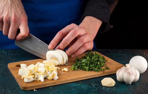 Отварите яйца и порубите кубиками. Нашинкуйте зелень и измельчите чеснок.