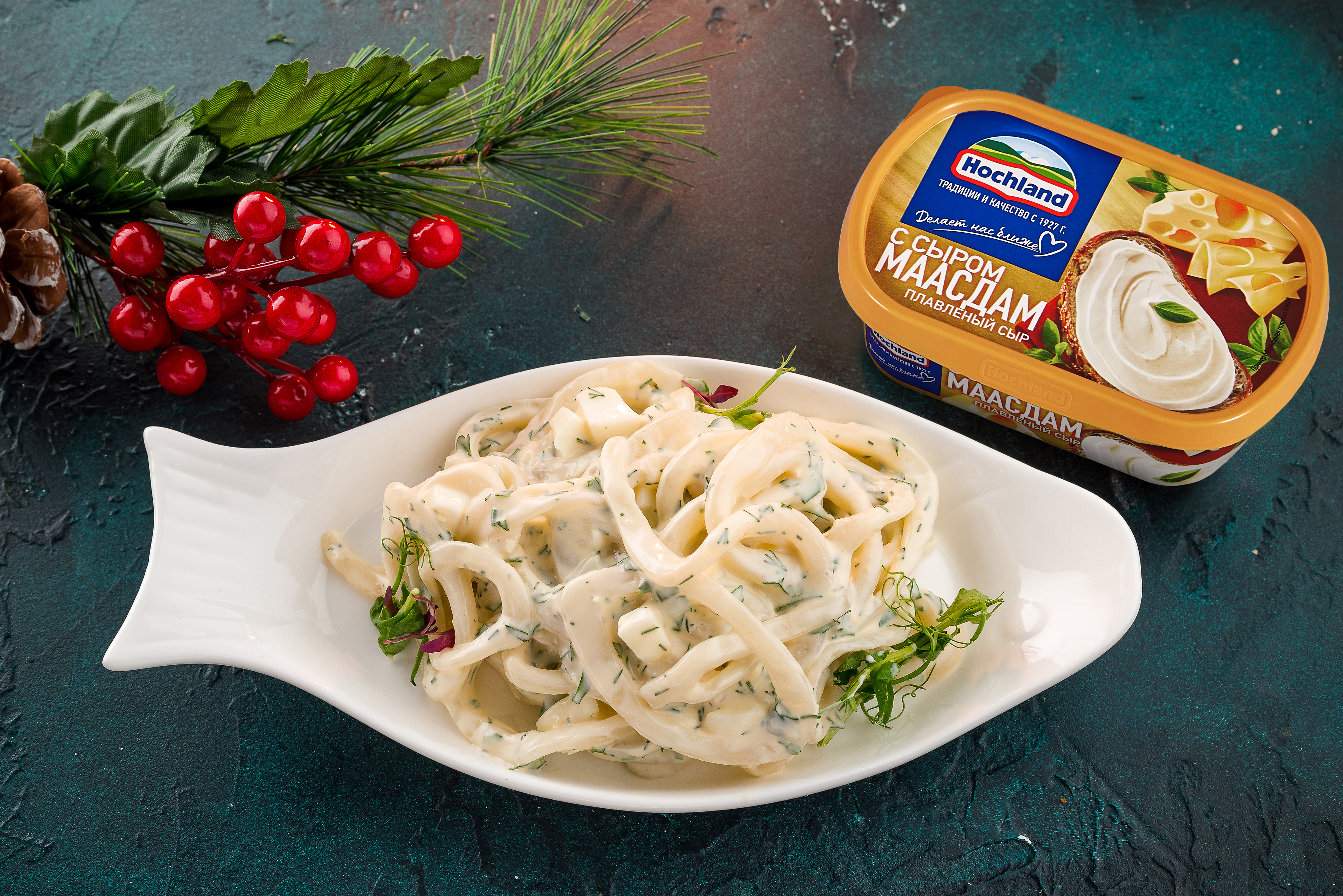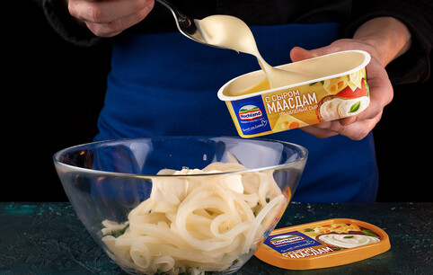 Смешайте яйца, кальмары, чеснок, зелень, сыр и заправьте салат майонезом.
