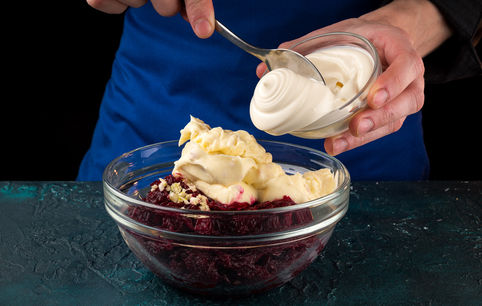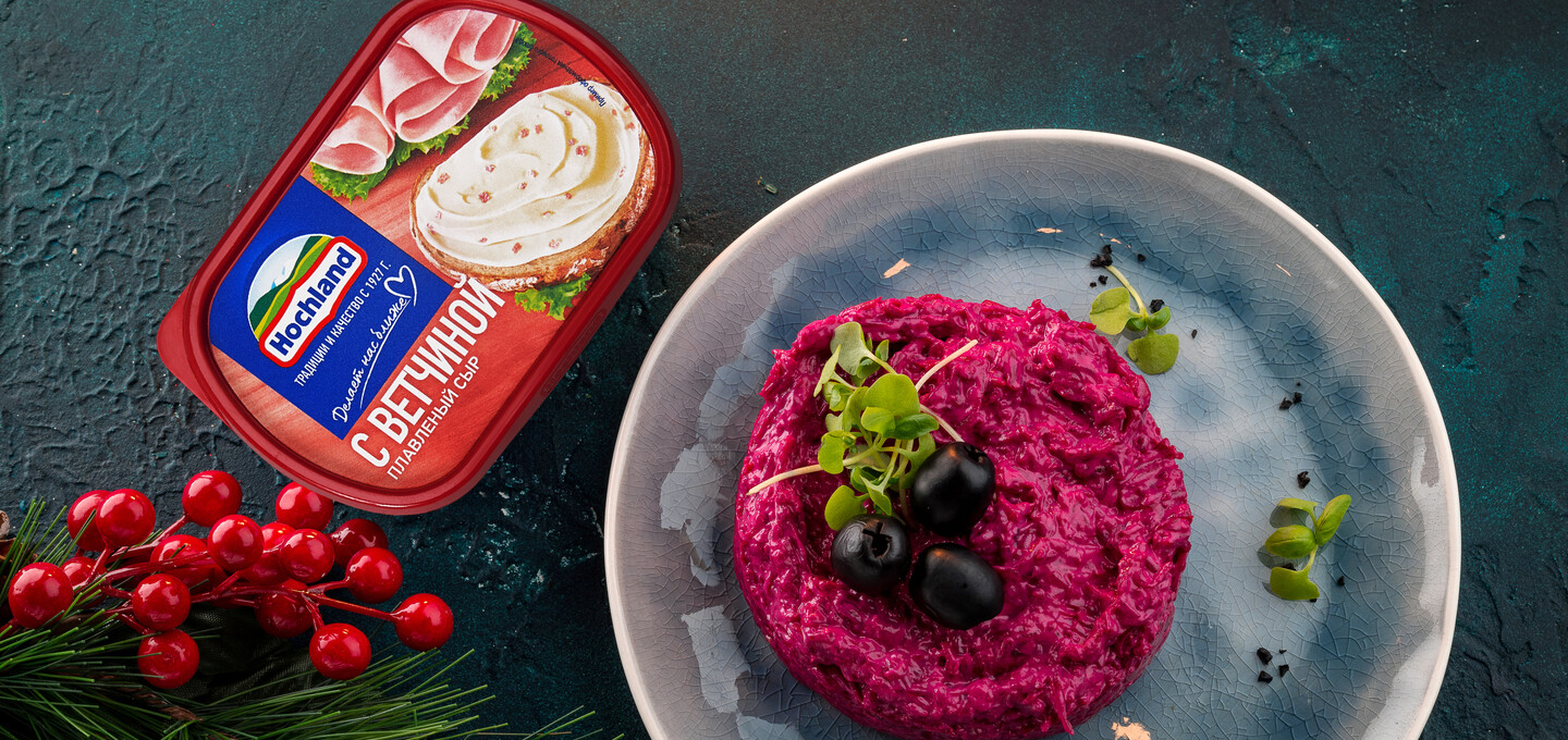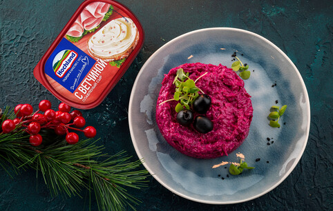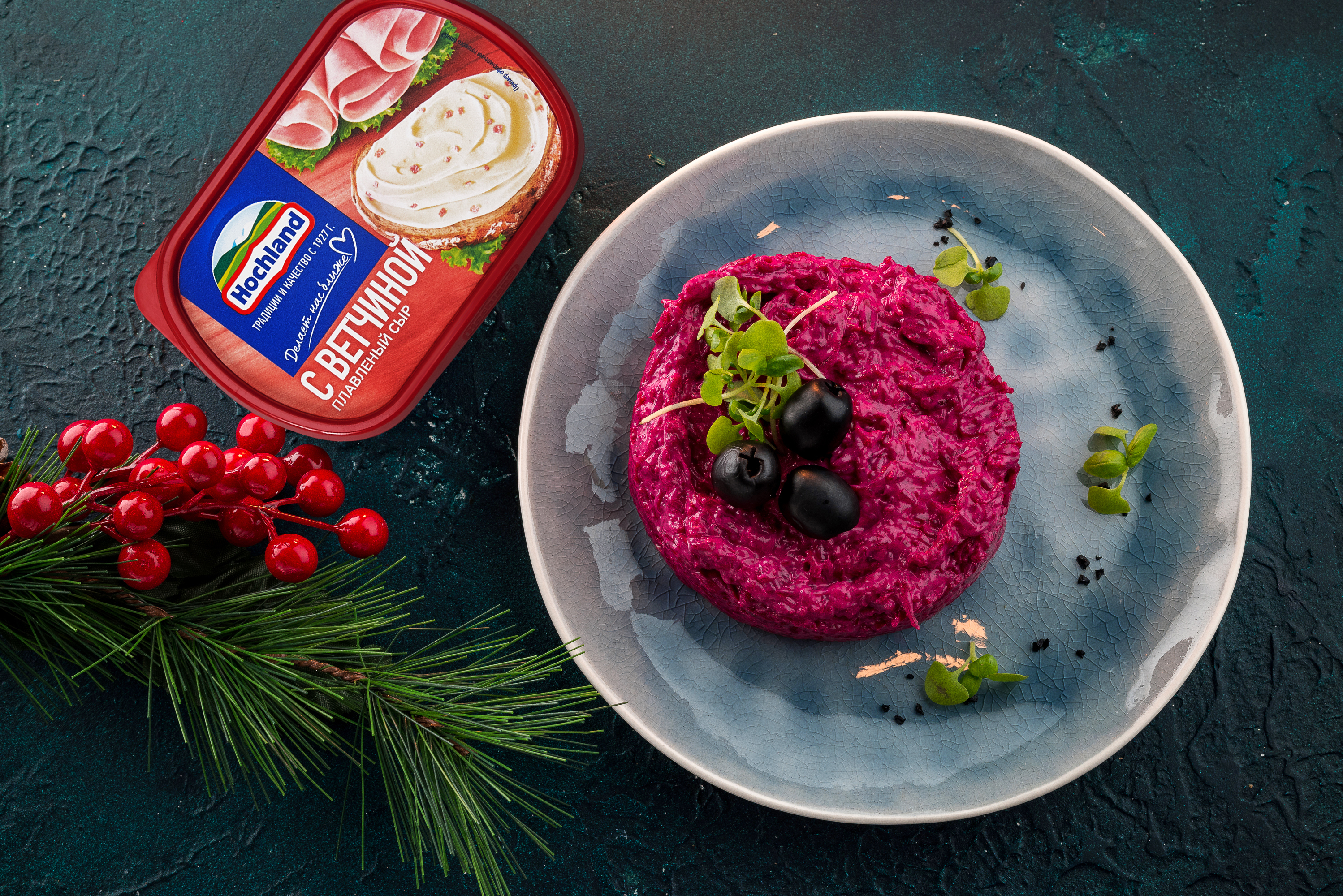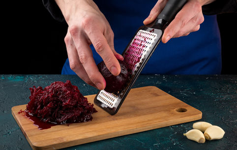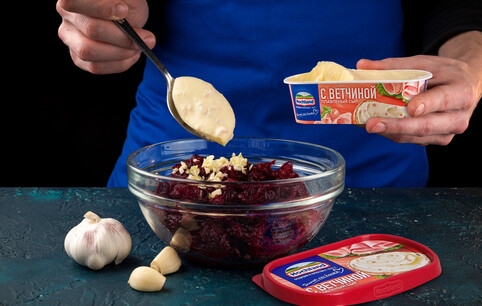Отварите свеклу и натрите ее на средней терке. Измельчите чеснок.