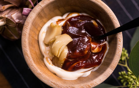 Запеченный чеснок растираем с майонезом и томатным соусом.